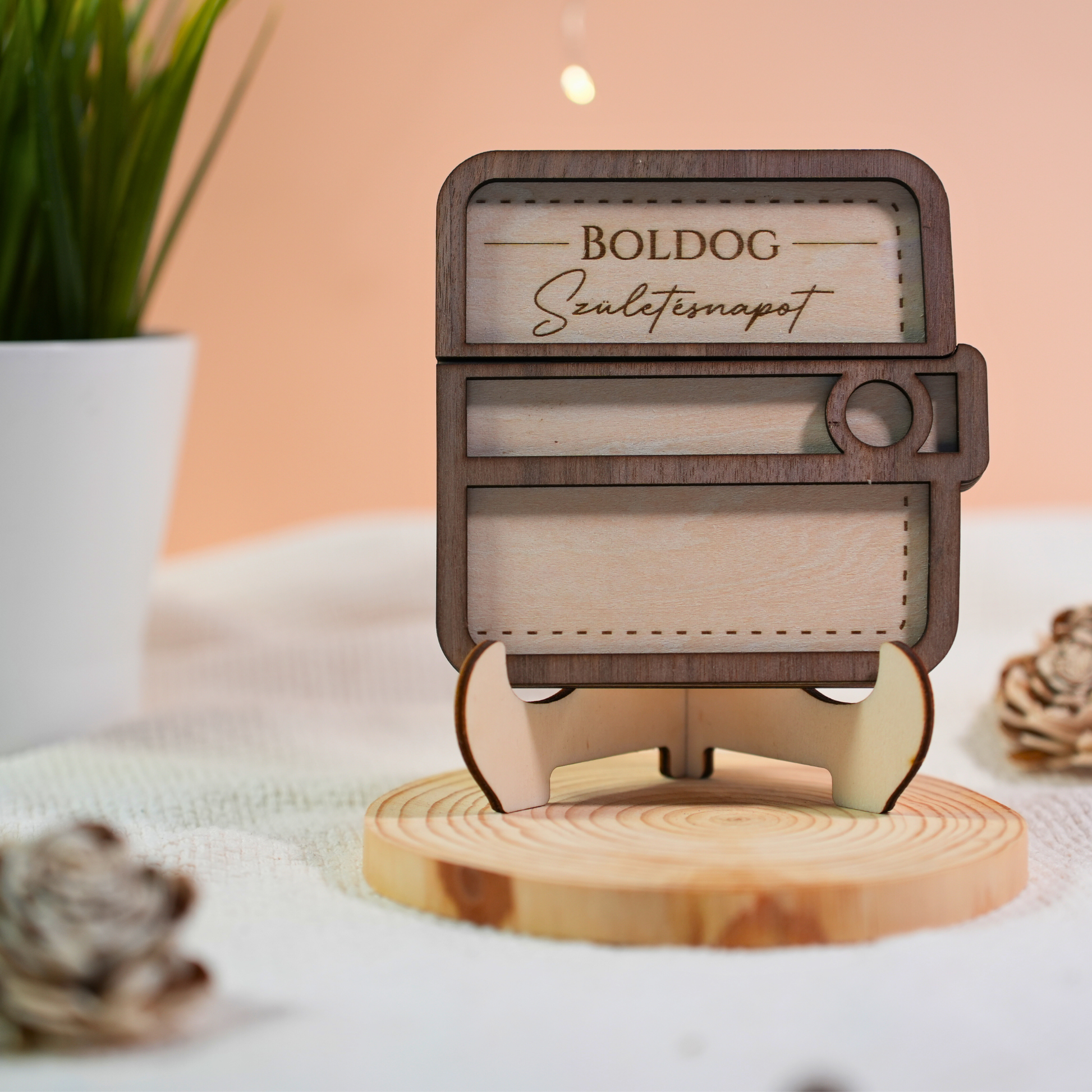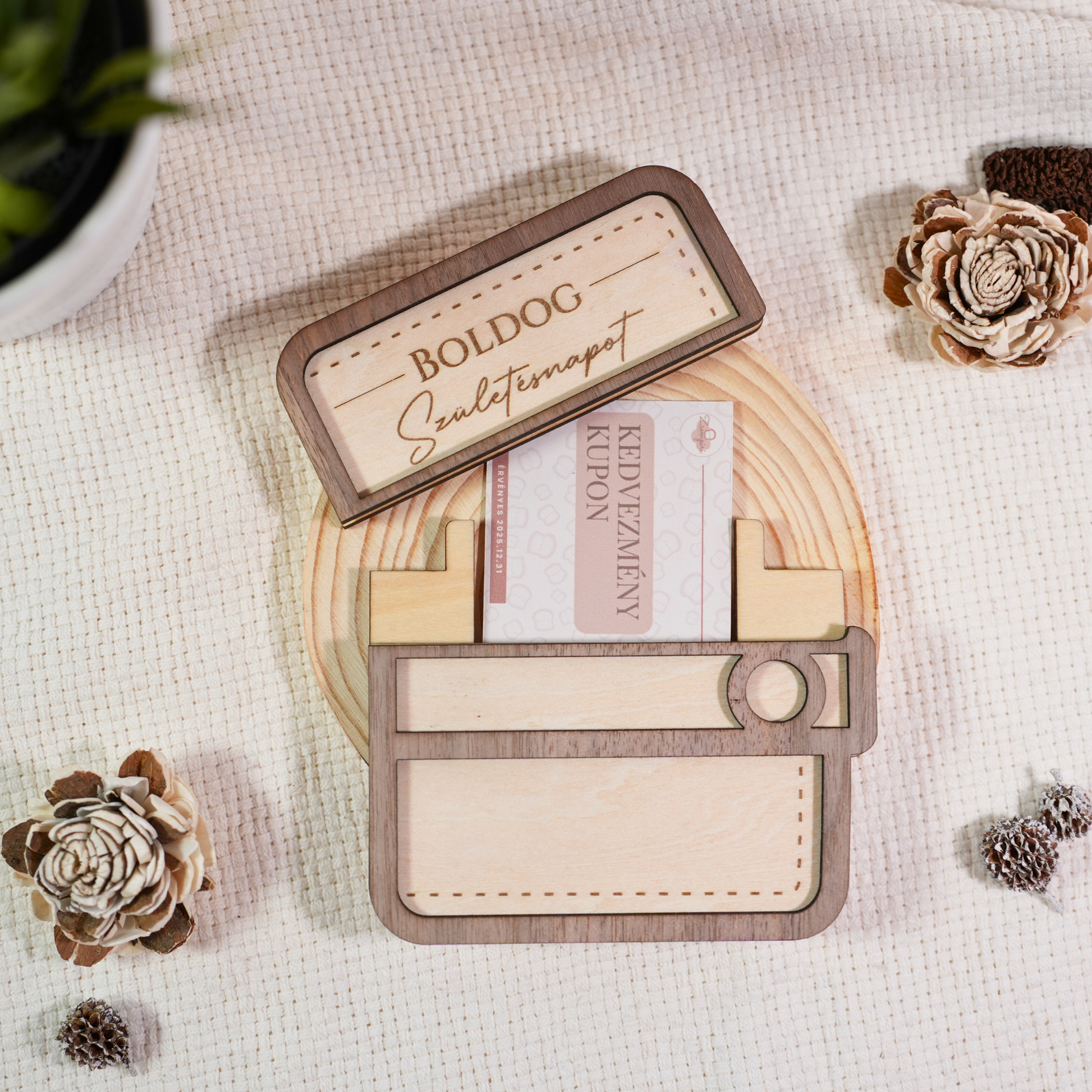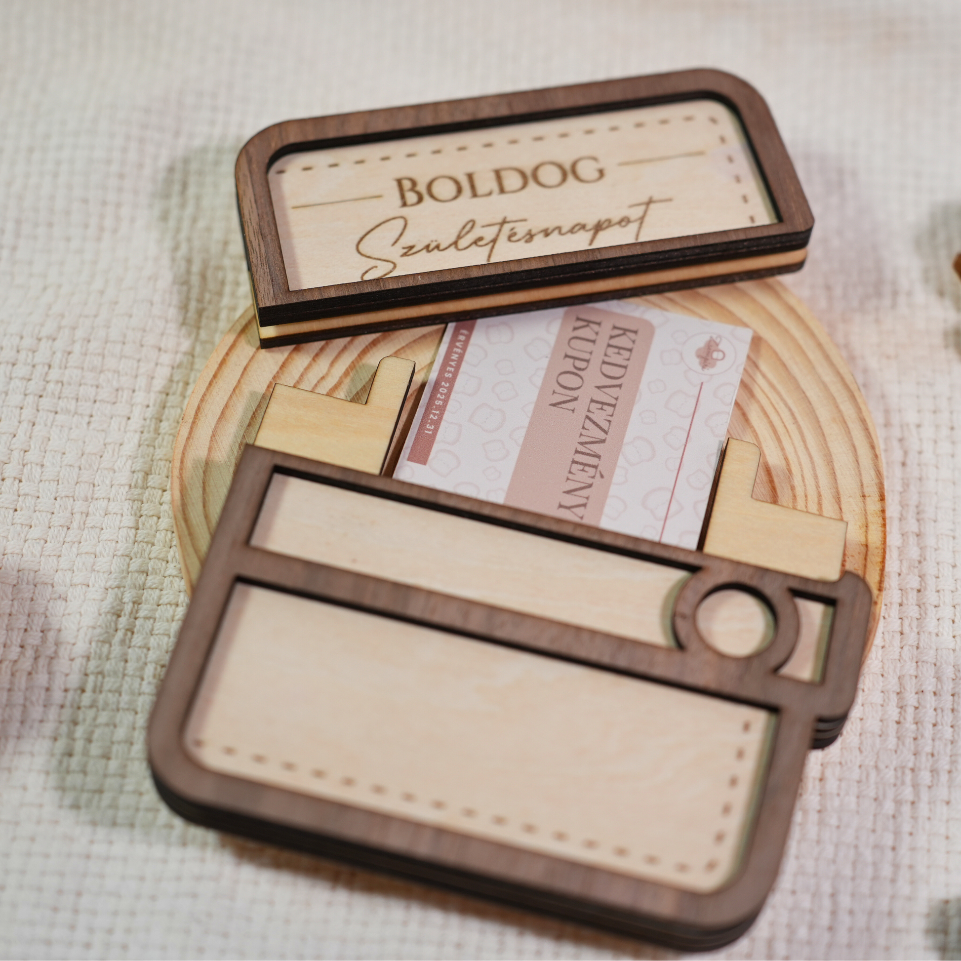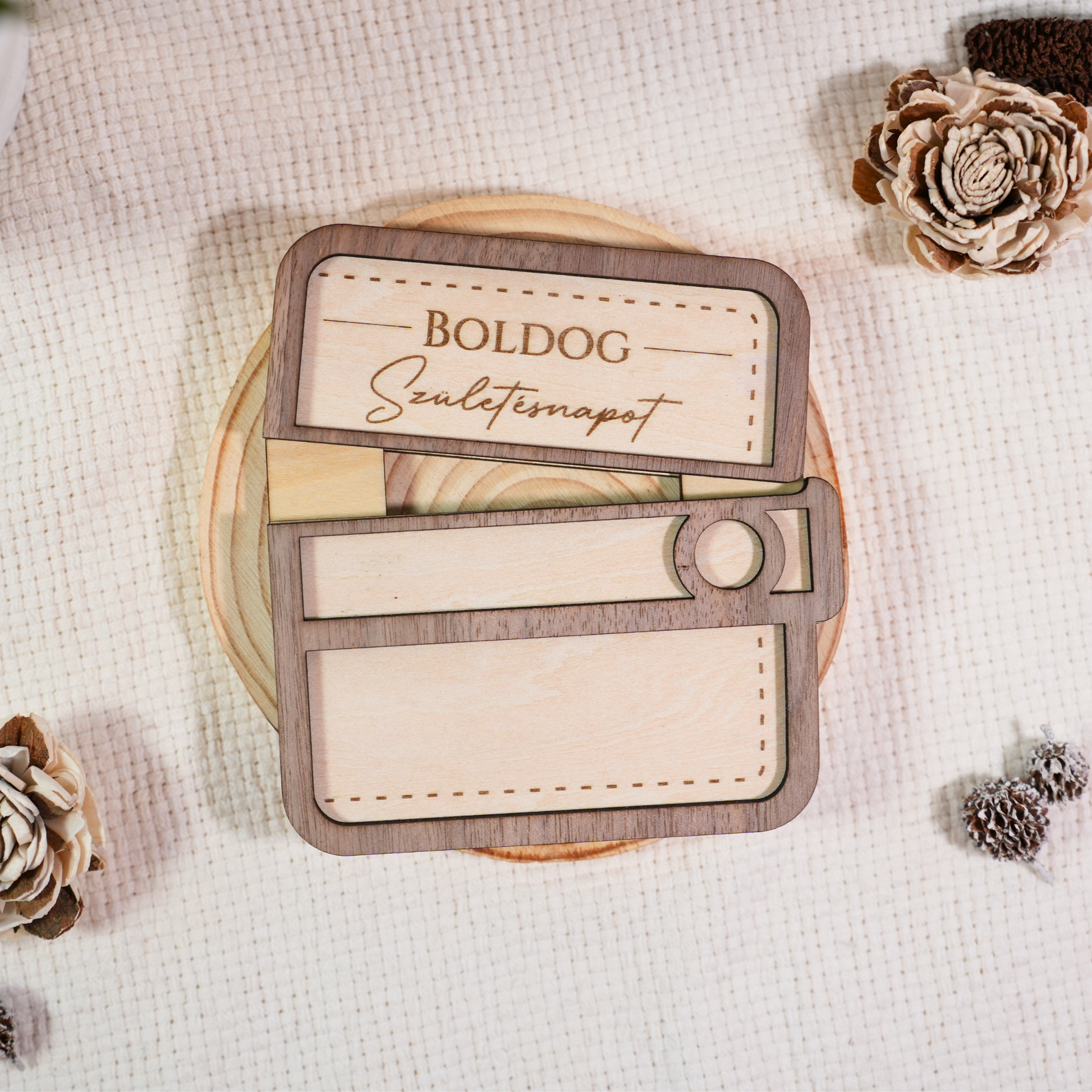 Ez a fából készült, pénztárca formájú tartó nem csak egy csomagolás. Ez teszi a készpénzt vagy az ajándékkártyát valódi, átadható tárggyá. Amikor az ünnepelt a kezébe veszi, nem egy papírfecnit érez, hanem a fa tömörségét és a rétegelt textúrák minőségét.