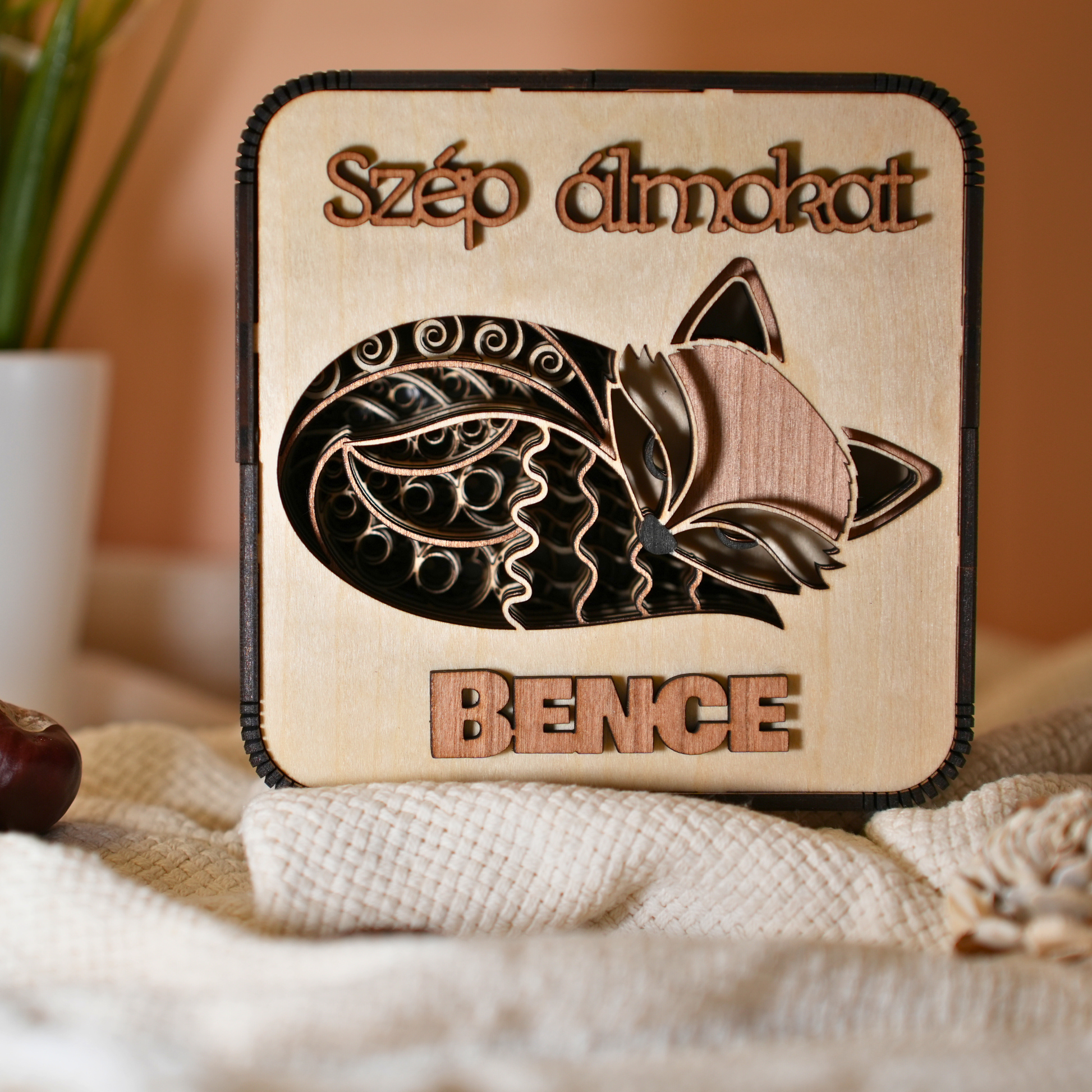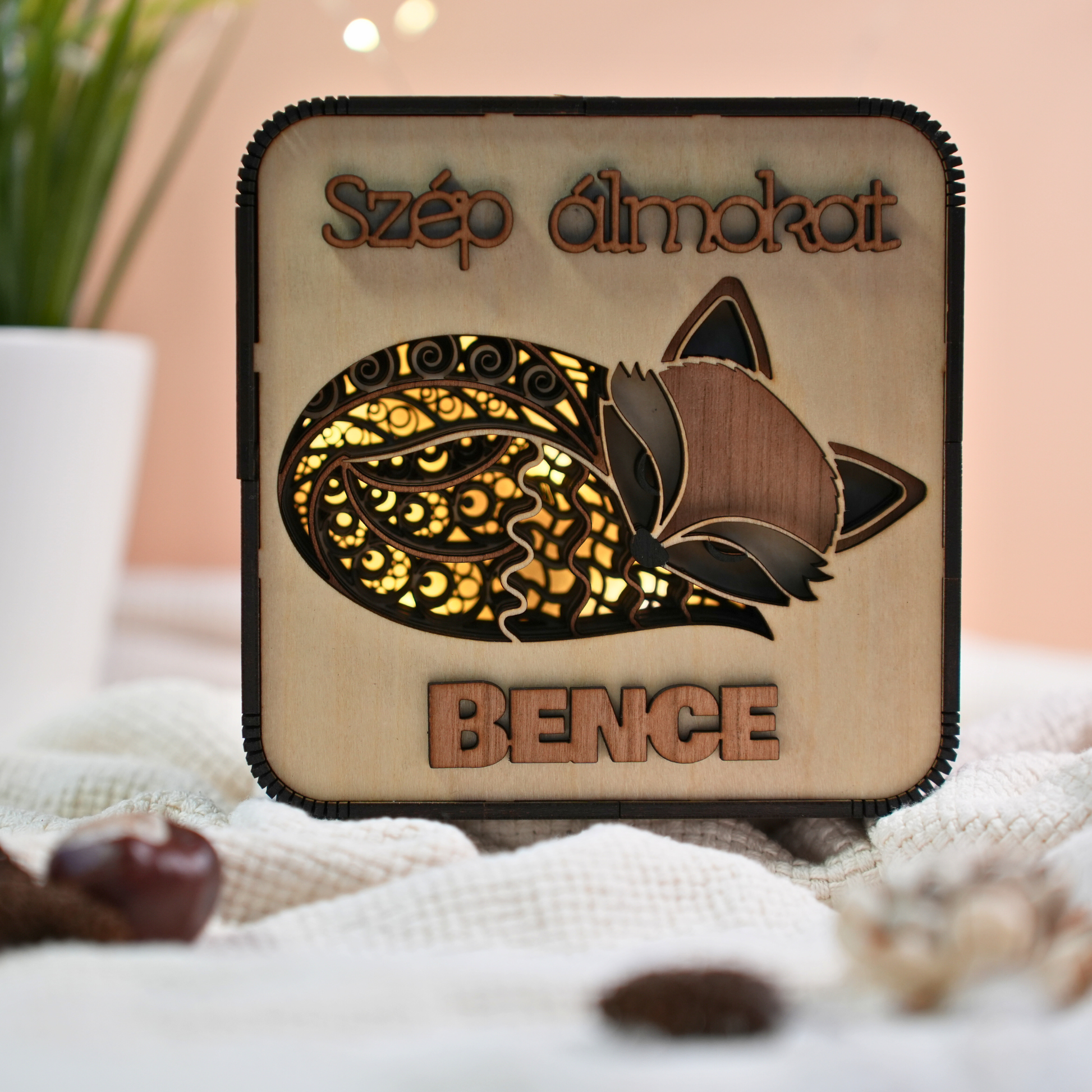 Ez a névre szóló rókás lámpa nem csak egy tárgy – egy hűséges kis társ az álmok birodalmában.