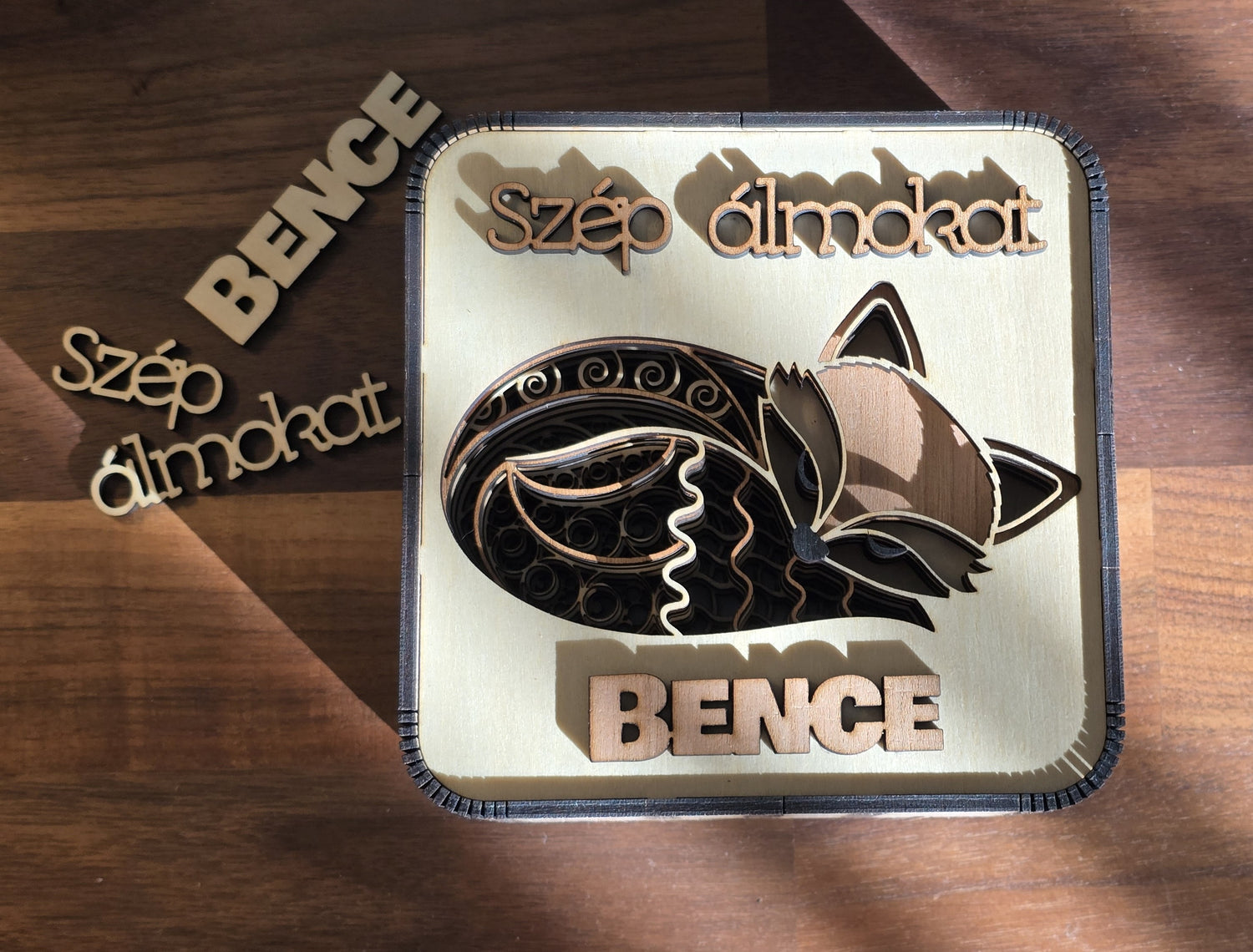 A róka vöröses bundáját és a feliratokat cseresznyefából vágtuk ki. Ez adja azt a gyönyörű, természetes kontrasztot a világos nyírfa kerettel, amit semmilyen műanyag nem tud utánozni.