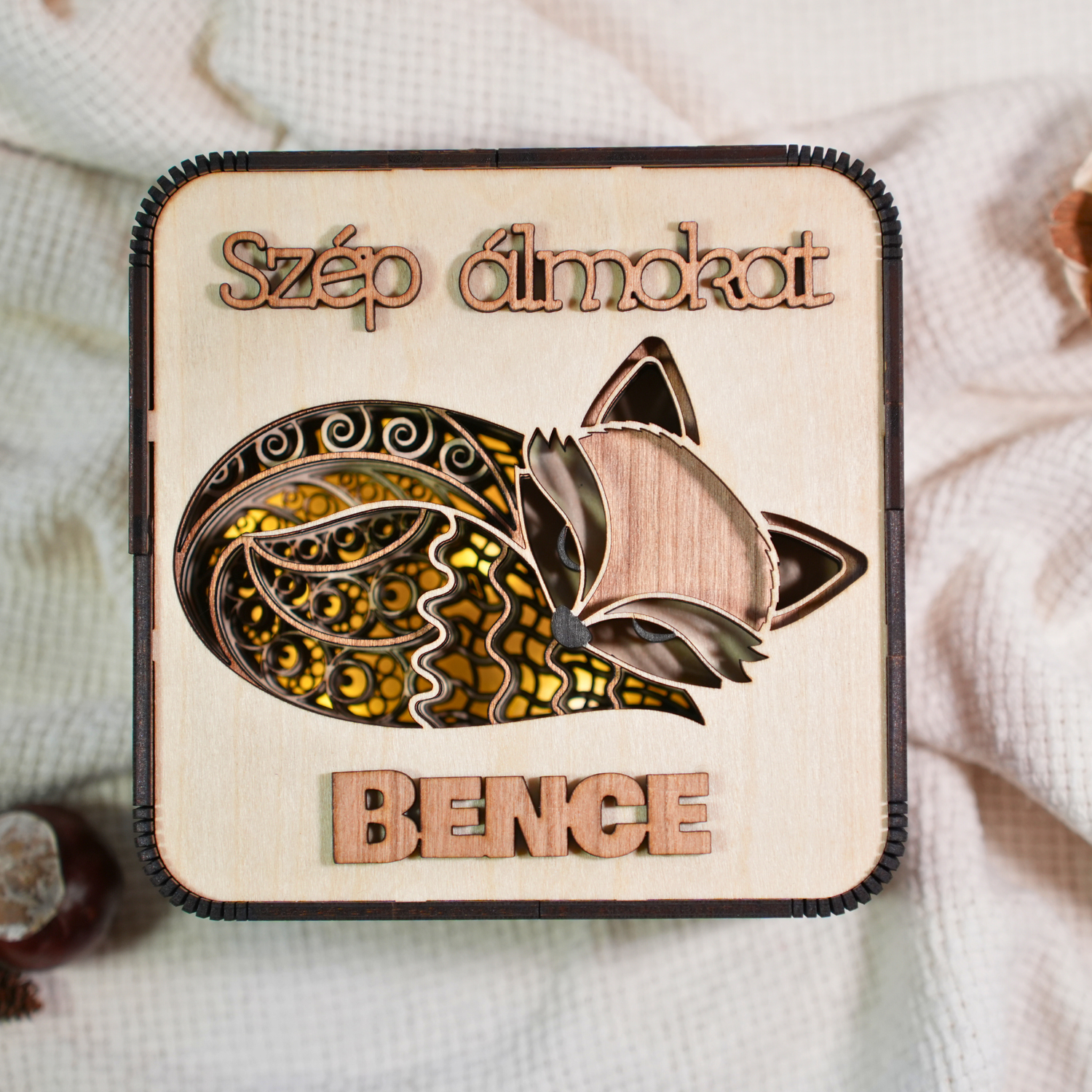 Prémium Névre Szóló Rókás Fa Éjszakai Fény - Cseresznyefa Betéttel