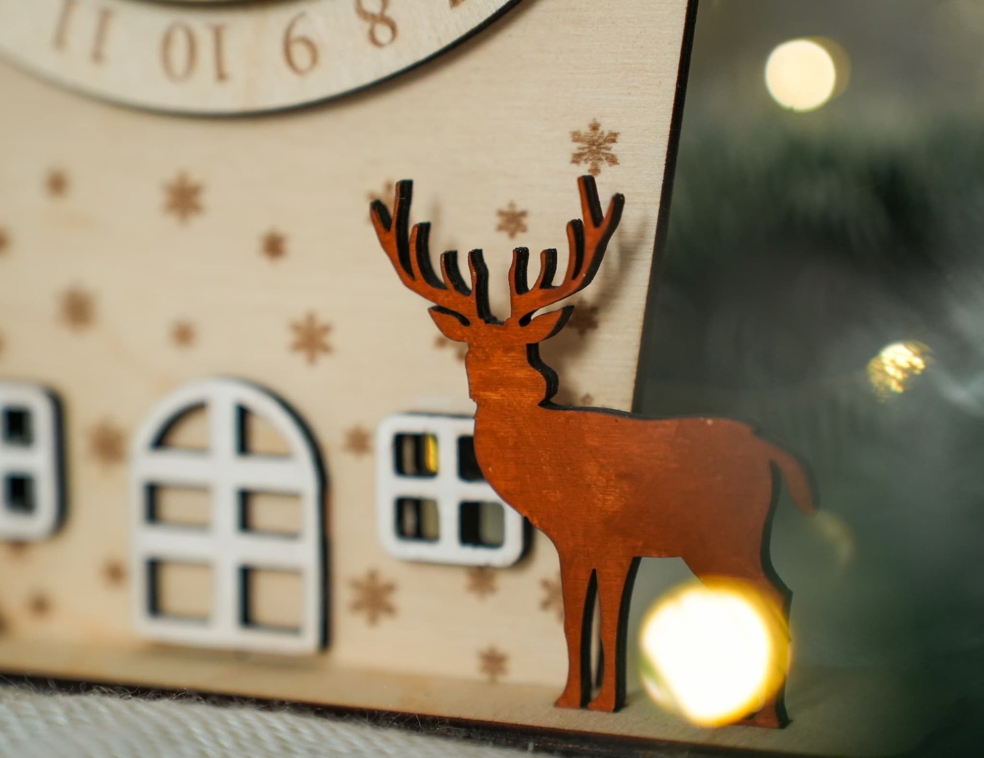 A házikón a "nap Karácsonyig" felirat elegáns, arany csillámos bevonatot kapott, ami megcsillan a karácsonyi fényekben, de nem giccses. A talpon álló kis fenyő és a szarvas pedig térbeli mélységet ad a tárgynak.